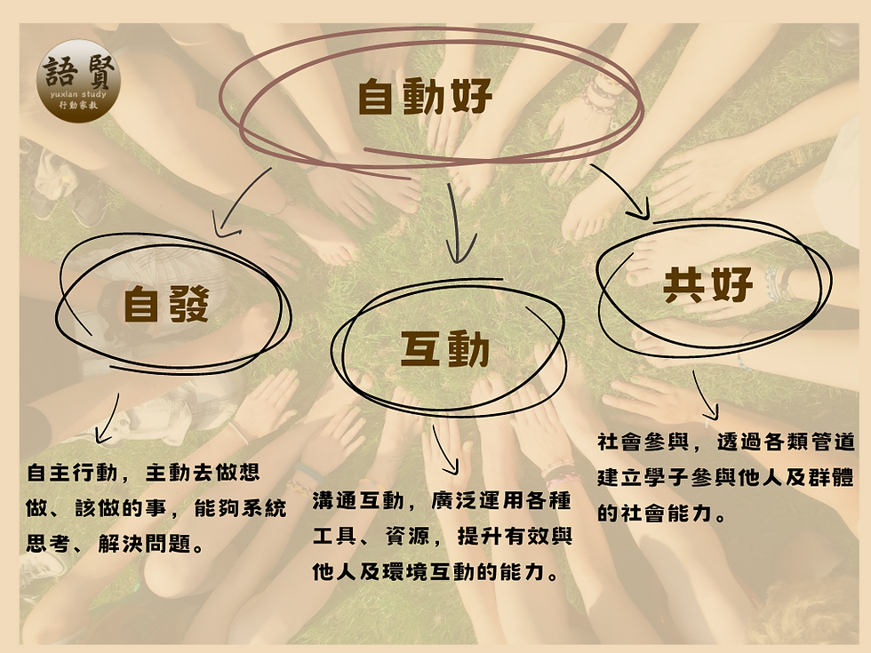 108課綱所提出的素養概念,並非推翻九年一貫的能力導向,而是透過課程設計,已能力為基礎,促成【自發】、【互動】、【共好】的學習(簡稱自動好),培育學子成為「終身學習者」。